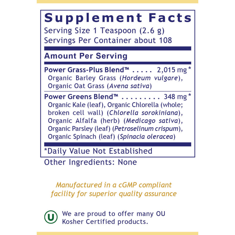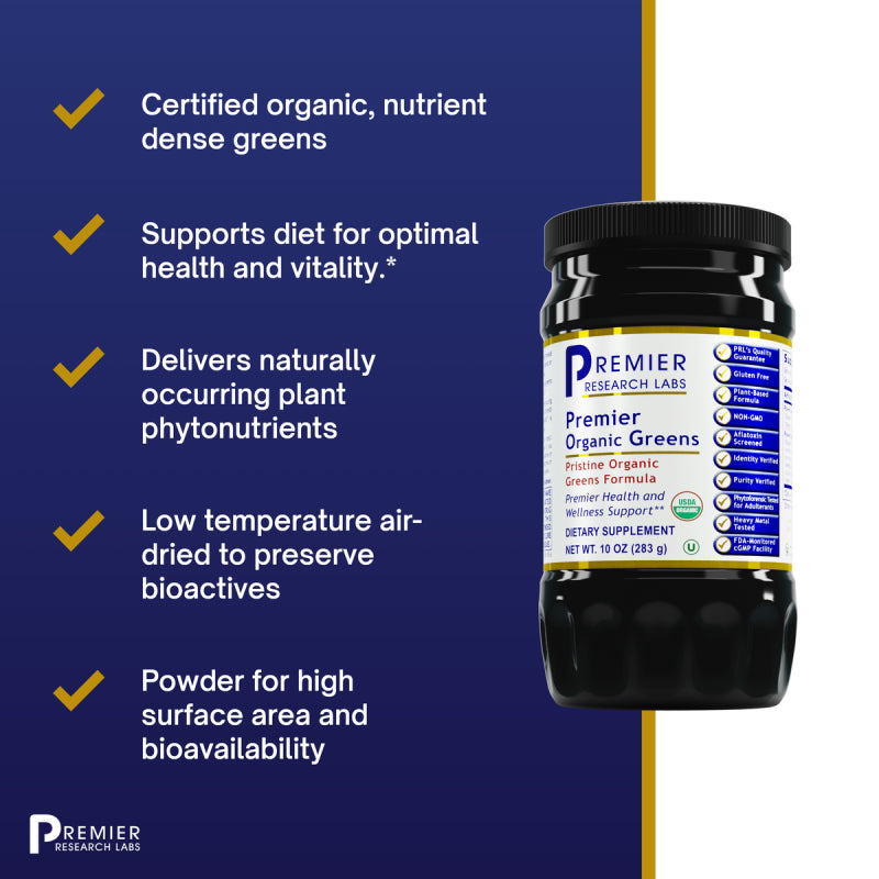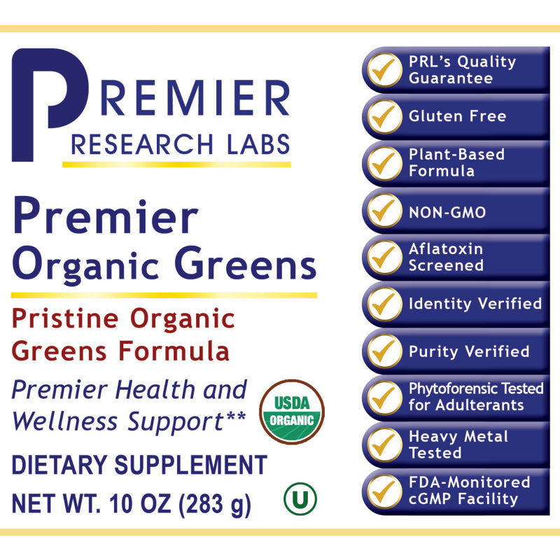 Premier Research Labs有機綠蔬粉為天然活性來源,有機,無麩質,純素友善的超級食物。絕不經薰蒸,輻射,溶劑萃取或高溫破壞。Premier Research Labs的品質保證,確保有機綠蔬粉符合美國 FDA 對於原料真實性,純度,強度與成分的規範,並檢驗各種污染物,包括農藥,非有機物質與重金屬(砷、汞、鎘、鉛)。